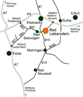 über die A 7 bis zum Kirchheimer Dreieck, dann über die A 4 Richtung Eisenach bis zur Abfahrt Friedewald, weiter über die B 62 nach Bad Salzungen. Über Barchfeld weiter nach Bad Liebenstein.